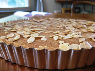 Remove shell from freezer, spread as even a layer as you can of jam onto the pastry base. Top with frangipane, spreading to cover the entire surface of the tart. Smooth the top and pop into the oven for 30 minutes. Five minutes before the tart is done, the top will be poofy and brownish. Remove from oven and strew flaked almonds on top and return to the heat for the last five minutes of baking.